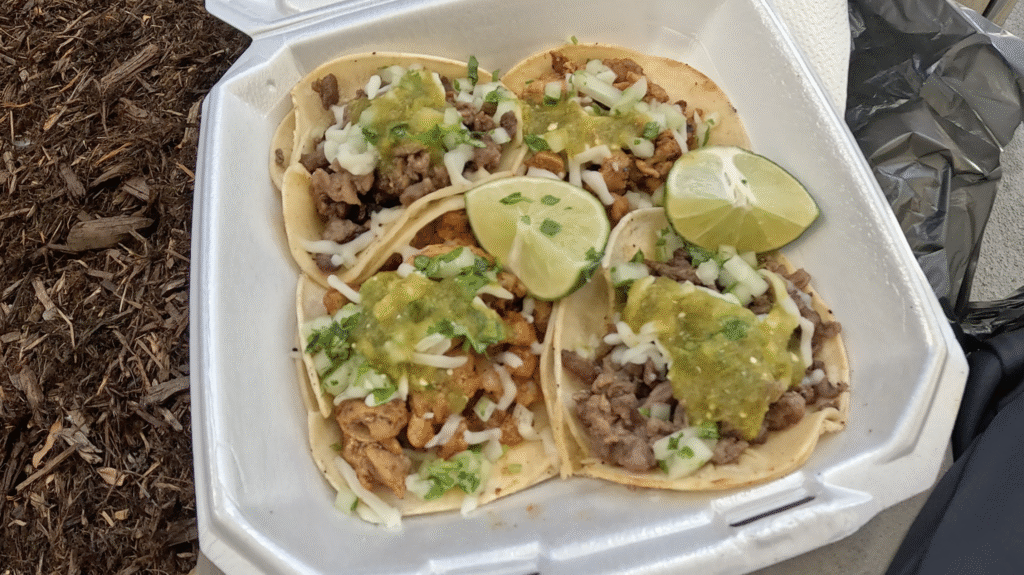 The person working mentioned that the barbacoa is the most popular item and that it was sold out… I ended up getting 4 tacos, 2 asada and 2 pastor tacos for $12! I also got a can of Pepsi for a grand total of $13. I decided to sit near the stairway from the Taco cart. There are tables with seats but I believe it’s for another food establishment, don’t want to disrespect any business.